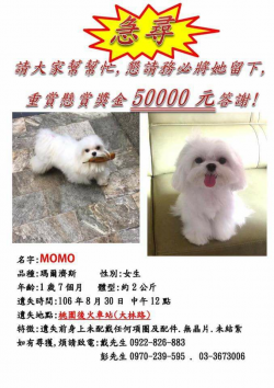 【尋找瑪爾濟斯~MOMO 地點 桃園市桃園區】 轉貼內容我們家寶貝MOMO送去美容院洗澡後因美容院疏失導致MOMO跑走了,家裡的人都非常擔心著急,如果有看到瑪爾,無論如何都還請聯絡我0953135831,或者我的爸爸0922826883,非常感謝大家幫忙,謝謝。http://twpetsearch.arlinks.net/2017/09/momo-taoyuan-taoyuan-malt...... [閱讀更多]