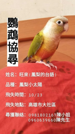 尋找太陽鸚鵡~旺來 地點 高雄市大社區 Dashe , Kaohsiung ,Sun parakeet 【尋找太陽鸚鵡~旺來 地點 高雄市大社區】 轉貼內容【飛失協尋】 姓名:旺來(鳳梨的台語)腳環一銀一紫紅 品種:鳳梨小太陽 飛失時間:10/23白天 飛失地點:高雄市大社區 尋…https://twpetsearch.arlinks.net/2019/10...... [閱讀更多]