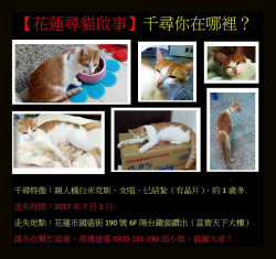 尋找貓咪~千尋 地點 花蓮縣花蓮市 Hualien , Hualien