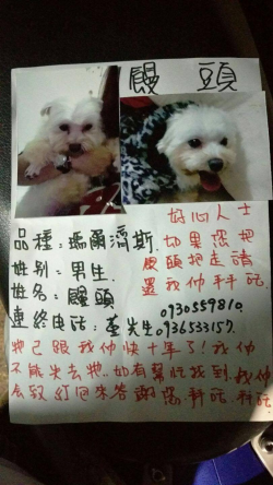 【尋找瑪爾濟斯~饅頭 地點 台南市玉井區】 轉貼內容尋狗啟示 特徵:淚腺紅紅的 腳趾也紅紅的摸後腿會生氣剛剪毛完不久 只留頭叫饅頭會有反應在玉井不見的!中正幼稚園附近往竹圍楠西方向!麻煩好心人士可以把狗狗還給主人這隻狗狗已經跟主人很久了找到會有謝禮致意麻煩聯絡電話 0930559810 0936533157http://twpetsearch.arlinks.net/2017/07/y...... [閱讀更多]