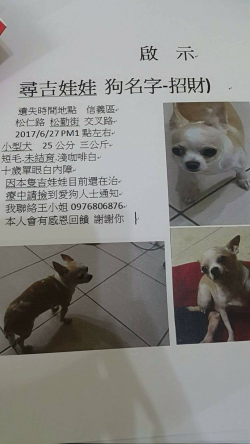 【尋找吉娃娃~招財 地點 台北市信義區】 轉貼內容聯絡電話 0976806876http://twpetsearch.arlinks.net/2017/06/xinyi-taipei-chihuahua.html ... [閱讀更多]