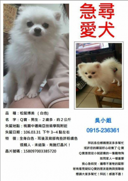 【尋找博美犬~Q寶 地點 桃園市中壢區】 轉貼內容Q寶~媽媽不想習慣你不在身邊的生活希望你現在的主人可以帶你去掃晶片,媽媽很想你!真的很想你!???疑似被人抱回家飼養,請大家幫幫忙多多分享!寵物名:Q寶性別:公品種;博美犬,白色年紀:2歲多走失時間:2017.03.31 下午3點左右走失地點:中壢南亞技術學院附近,龍福路,龍昌路,龍東路附近是否植入晶片:有,也有登記主人資料晶片號碼:15...... [閱讀更多]