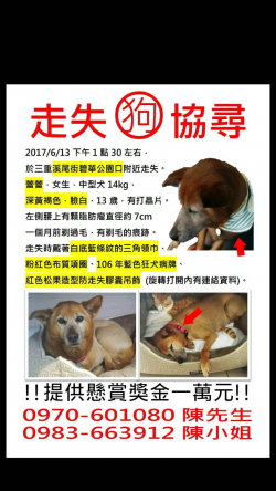 【尋找狗狗~蕾蕾 地點 新北市三重區】 轉貼內容[走失協尋] 求分享!! 狗狗很老了,禁不起流浪!!!!新增尋獲獎金" 一萬元 「 !!! 請大家幫幫忙 她是我們家人!!!蕾蕾在三重走丟了 拜託大家幫我分享一下6/13下午1:30 家中長輩開門時不小心讓狗狗從門縫溜出去地點 在三重溪尾街碧華公園入口附近狗狗叫蕾蕾 中型犬14公斤 年紀約13歲,米克斯 黃褐色 白臉 女生已紥左側腰上有顆脂...... [閱讀更多]
