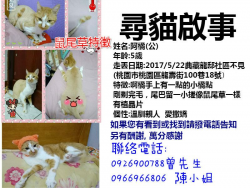 【尋找貓咪~ 地點 桃園市蘆竹區】 轉貼內容尋貓啟事!!!我的貓咪走失了???走失地點:桃園市蘆竹區南福街的星河社區聯繫電話:0983473483解小姐 貓咪是長毛喜馬拉雅品種,剛剃毛,脖子上帶藍色小花蝴蝶結,昨天晚上走失的,我已經找社區找整晚了,麻煩如果有人看到或撿到請電話聯絡0983473483,拜託大家幫忙了,我已經快急瘋了,貓咪生病了需要吃藥,拜託大家幫忙宣傳分享!拜託拜託 ...... [閱讀更多]