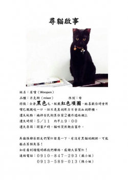 【尋找貓咪~Woopen 地點 高雄市楠梓區】 轉貼內容(尋貓啟示)高雄楠梓 母 黑貓 走失姓名:屋噴(Woopen)性別:母品種:米克斯(mixer)遺失地點:高雄市楠梓區安民街遺失時間:5/11 AM9:00 走失遺失原因:開窗戶時.突然衝出窗外特徵:全身黑色毛.配戴紅色項圈有晶片.已結紮體重:4公斤聯絡電話:0910847293(蘇小姐)0913589013(陳小姐)在請大家幫忙留...... [閱讀更多]