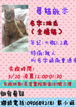 【尋找貓咪~地瓜 地點 桃園市中壢區】 轉貼內容幫我找找我們家的孩子???,幫我推推聯絡電話 0906892181http://twpetsearch.arlinks.net/2017/05/zhongli-taoyuan_21.html ... [閱讀更多]