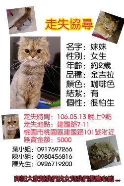 【尋找金吉拉~妹妹 地點 桃園市桃園區】 轉貼內容請大家幫忙分享!有撿到貓咪也可以跟我們聯絡!主人心急找貓咪,拜託大家了。 貓樂福桃園後站店03-3660333桃園市桃園區建國路99號聯絡電話091769726609804568160926719200http://twpetsearch.arlinks.net/2017/05/taoyuan-taoyuan-chinchilla-pe...... [閱讀更多]