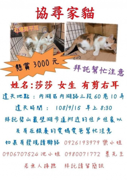 尋找貓咪~莎莎 地點 台北市內湖區 Neihu , Taipei