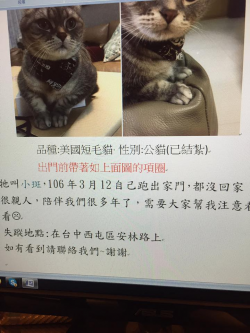 【尋找美國短毛貓~小斑 地點 台中市西屯區】 轉貼內容協尋美國短毛貓幫幫我們找尋貓咪?如果有看到請聯絡我們,養了快10年的胖胖貓叫小斑,他在西屯安林路上不見的,謝謝大家!http://twpetsearch.arlinks.net/2017/03/xitun-taichung-american-shorthair.html ... [閱讀更多]