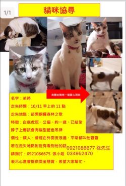 尋找貓咪~弟將 地點 苗栗縣銅鑼鄉 Tongluo , Miaoli 【尋找貓咪~弟將 地點 苗栗縣銅鑼鄉】 轉貼內容協尋!聯絡電話 0921086677 0921086675 034952470…https://twpetsearch.arlinks.net/2019/10/tongluo-miaoli.html ...... [閱讀更多]
