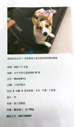【尋找柯基犬~Bimo 地點 台中市西屯區】 轉貼內容Bimo(鼻毛)於2017/2/23下午走失了!如大家有路經 台中市西屯區福雅路附近,請幫忙留意是否有Bimo(鼻毛)的身影,謝謝大家!!!聯絡電話 0921388065http://twpetsearch.arlinks.net/2017/02/bimo-xitun-taichung-corgi.html ... [閱讀更多]