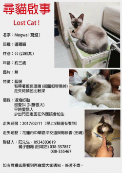 【尋找貓咪~Mogwai 地點 花蓮縣花蓮市】 轉貼內容【花蓮-尋貓啟事-魔怪你在哪裡?】聯絡電話 0934303019038-357857038-355467http://twpetsearch.arlinks.net/2017/02/mogwai-hualien-hualien.html ... [閱讀更多]