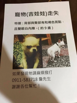 【尋找吉娃娃~ 地點 桃園市中壢區中福路興和路】 轉貼內容我家吉娃娃走失了走失時間:1/3清晨6點左右走失地點:中壢區中福路興和路交叉路口特徵:小白狗,臀部與背部都有褐色斑點,耳朵也是褐色,雙眼白內障聯絡方式:0346231360911-583718詹先生或者至中壢區忠福里辦公處http://twpetsearch.arlinks.net/2017/01/zhongli-taoyuan-...... [閱讀更多]