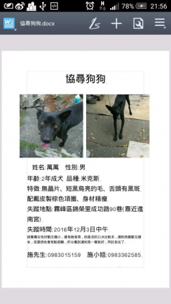 【尋找狗狗~萬萬 地點 台中市霧峰區錦榮里】 轉貼內容聯絡電話0983015159http://twpetsearch.arlinks.net/2017/01/wufeng-taichung.html ... [閱讀更多]