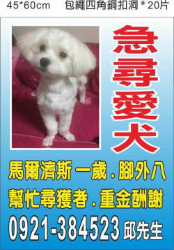 【尋找瑪爾濟斯~ 地點 桃園市桃園區】 轉貼內容聯絡電話 0921384523http://twpetsearch.arlinks.net/2016/11/taoyuan-taoyuan-maltease.html ... [閱讀更多]