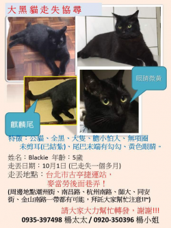 【尋找貓咪~Blackie 地點 台北市大安區羅斯福路35巷】 轉貼內容大黑貓走失協尋!!(請大家幫忙迴文幫忙推) 天天都出去找,能力可及的方法都試過了,可是一眼都沒看見他,但絕對不放棄尋找!請大家有任何建議都可以跟我說! *特別詢問–由於貓跑走的巷弄是羅斯福路35巷,極有可能跳進 「和平東路電力公司"的圍牆裡了,但因公家機關無法進去尋找, 請有認識在裡面上班的愛貓人士能私訊與我聯絡...... [閱讀更多]