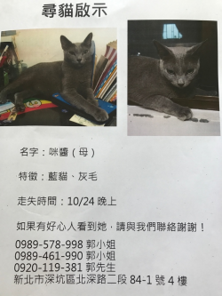 【尋找貓咪~咪醬 地點 新北市深坑區北深路二段84-1號】 轉貼內容走失協尋 遺失地點:深坑北深路二段84-1號貓咪花色及特徵:灰色 略胖貓咪性別:母貓咪名字:咪醬是否結紮:是有無項圈(款式):無相片(必須提供):http://i.imgur.com/9SisbN2.jpg其他資訊:昨天晚上走失。連絡電話0989578998http://twpetsearch.arlinks.net/...... [閱讀更多]