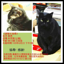【尋找貓咪~ 地點 嘉義市西區有忠路546巷】 轉貼內容我家的貓還沒找到家人跟另一隻貓都很想他拜託大家看到黑貓幫忙留意,感恩希望他平安回家聯絡電話 0921015212http://twpetsearch.arlinks.net/2016/09/546-west-chiayi.html ... [閱讀更多]