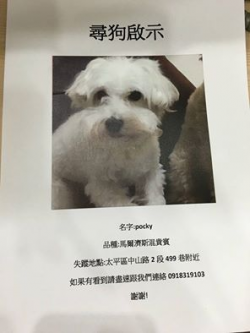 【尋找馬爾濟斯~pocky 地點 台中市太平區2段499巷】 轉貼內容請幫忙分享協尋,朋友的狗兒 9/20走失,名字:pocky,男孩,馬爾濟斯混貴賓,白色,膽小個性親人愛撒嬌,走失時沒穿任何衣服,走失地點:台中市太平區2段499巷附近,如有發現請幫忙聯絡0918319103,拜託 謝謝http://twpetsearch.arlinks.net/2016/09/pocky-2499-t...... [閱讀更多]