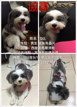 【尋找西施犬~Q比 地點 高雄市左營區世運大道】 轉貼內容拜託大家幫忙分享出去好嗎?寶貝今天一早家人帶出去散步,結果一個不留神被人偷抱走了!一直找不到牠..?我真的很心急,拜託大家幫忙我轉貼分享出去,拜託…?牠開過刀目前吃的飼料是醫生處方的飼料不能亂吃,拜託抱走牠的還給我,求求你們?聯絡電話 0932822861http://twpetsearch.arlinks.net/2016/09...... [閱讀更多]