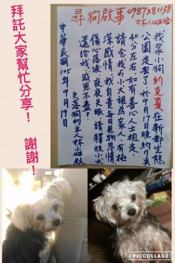 【尋找約克夏~ 地點 台中市北屯區新都生態公園】 轉貼內容急~拜託大家幫幫忙分享,謝謝!~尋狗啟示:約克夏 男生 1歲 2kg遺失時間:105/9/17 19:40遺失地點:台中市北屯區新都生態公園林小姐0987-381-187今天遇到心急如焚的林阿姨在找相依為命的狗狗,因不會上網只能貼傳單找愛犬,請大家幫忙轉貼分享!希望能快點幫她找回愛犬,謝謝大家~http://twpetsearch...... [閱讀更多]