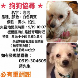 【尋找貴賓犬~泡泡 地點 新北市板橋區海山路體育場】 轉貼內容拜託大家幫忙了?這是我家的狗狗她昨天16:07分 在板橋海山路體育場附近走失了我們真的很著急 謝謝??http://twpetsearch.arlinks.net/2016/09/banqiao-new-taipei-poodle.html ... [閱讀更多]
