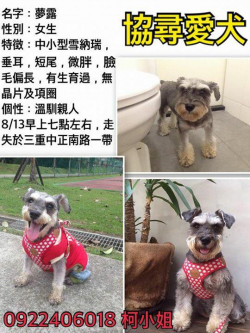 【尋找雪納瑞~夢露 地點 新北市三重區中正南路及重新路三段】 轉貼內容今天是我生日我們家夢露在我生日當天上午7點左右自己跑出去探險了,到派出所跟里長辦公室調閱監視器,看到她在家門口徘徊了好一陣子,因為門被關上沒辦法回家,後來消失在往重新路三段的方向的巷子。整個下午在附近每條巷弄繞了好幾圈,都沒有找到她,她絕對記得回家的路,只是到現在都還沒回來,可能是被善心人士撿走了。懇請大家幫忙轉貼,讓...... [閱讀更多]