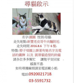 【尋找貓咪~圓圓 地點 新竹縣竹北市新豐老皮哥牛肉麵】 轉貼內容請大家幫忙尋找阿嬤家的貓貓不見 吃不下飯請好心人 看到通知我們謝謝聯絡電話0920021718http://twpetsearch.arlinks.net/2016/08/zhubei-hsinchu.html ... [閱讀更多]