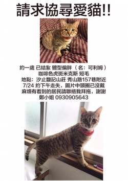【尋找貓咪~可利姆 地點 新北市汐止區秀山路157巷馥記山莊】 轉貼內容聯絡電話 0930905643http://twpetsearch.arlinks.net/2016/07/157-xizhi-new-taipei.html ... [閱讀更多]