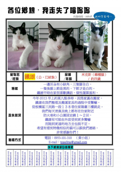 【尋找貓咪~鐵雄 地點 新北市板橋區三民路一段】 轉貼內容【尋貓啟事】這是我阿姨家的貓「鐵雄」,希望住在板橋三民路一段附近的朋友有看到鐵雄可以幫忙注意一下,聯絡電話 0953101310http://twpetsearch.arlinks.net/2016/07/banqiao-new-taipei_22.html ... [閱讀更多]