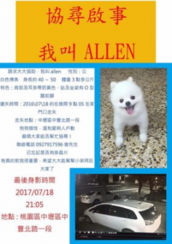 【尋找博美犬~allen 地點 桃園市中壢區中豐北路一段】 轉貼內容小弟跪求各位偉大的網路大大幫忙小弟 雖知小弟無能讓狗走失 罵我也好但真心希望他回來 查到晶片號碼了:900108001357953 勞煩各位了牠叫allen性別:公白色博美身長約40~50體重3點多公斤 有結紮特色:背部及耳多帶奶黃色,站及坐姿有O型腿的前腳遺失時間:2016\07\18 約在晚間9點05在家門口離家出走...... [閱讀更多]