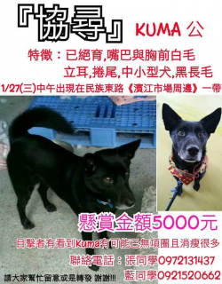 【尋找狗狗~Kuma 地點 新北市泰山區明志科大】 轉貼內容Kuma在外頭流浪許久了經過多次的尋找至今仍然沒有消息請大家幫忙讓Kuma回到我們身邊[明志科大 校犬]Kuma (公)已絕育 尚無晶片黑色毛髮 立耳胸前白毛長毛鎌刀尾年約八歲 體重約17KUMA走失時戴[紅色項圈][金色鈴鐺][粉色吊牌]請留意附近陌生犬隻如果您發現疑似Kuma的黑狗狗請設法留住牠並撥打下方電話藍同學09215...... [閱讀更多]