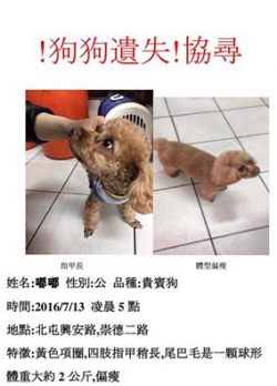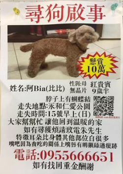 【尋找紅貴賓~阿Bia 地點 新北市永和區仁愛公園】 轉貼內容【獎金 10萬元~中永和乀捧友,懇請協尋分享】6月15日 於 仁愛公園走失,懇請幫忙留意您的幫忙 是牠唯一回家的路~聯絡電話 0955666651http://twpetsearch.arlinks.net/2016/07/bia-yonghe-new-taipei-poodle.html ... [閱讀更多]