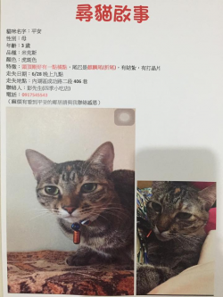 【尋找貓咪~平安 地點 台北市內湖區成功路二段】 轉貼內容聯絡電話 0917545453http://twpetsearch.arlinks.net/2016/07/neihu-taipei.html ... [閱讀更多]
