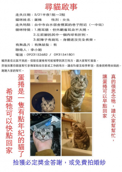 【尋找貓咪~蛋捲 地點 台中市北區一中街台水宿舍】 轉貼內容聯絡電話 0923152682http://twpetsearch.arlinks.net/2016/06/taichung-north.html ... [閱讀更多]