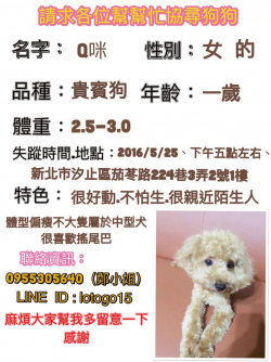 尋找貴賓犬~Q咪 地點 新北市汐止區茄苳路224巷3弄2號1樓