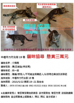 協尋獎金三萬元 尋找貓咪~小飛翔 地點 桃園市中壢區力行北街