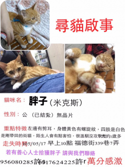 【尋找貓咪~胖子 地點 台北市南港區福德街339巷7弄】 轉貼內容聯絡電話 0956080285http://twpetsearch.arlinks.net/2016/05/3397-taipei-nangang.html ... [閱讀更多]