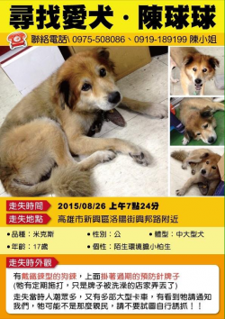【尋找狗狗~球球 地點 高雄市新興區洛陽街興邦路附近】 轉貼內容聯絡電話0975508806http://twpetsearch.arlinks.net/2016/05/kaohsiung-xinxing.html ... [閱讀更多]