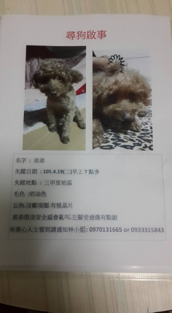 【尋找貴賓犬~弟弟 地點 台南市仁德區三甲里】 轉貼內容聯絡電話 0970131665http://twpetsearch.arlinks.net/2016/04/tainan-rende-poodle.html ... [閱讀更多]