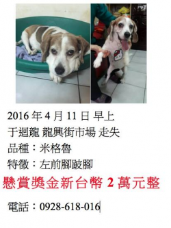 【協尋獎金 $20,000 元 尋找米格魯~pillow 地點 新北市板橋區龍興街市場】 轉貼內容拜託~大家幫忙找我們家pillow,牠已經走失兩天了,而且最近雨又這麼大,然後左腳又掰咖,我們整個家族的人都很愛牠,如果有看到像這樣的狗,請速速撥打下面的電話,嗚嗚…聯絡電話 0928618016http://twpetsearch.arlinks.net/2016/04/20000-pil...... [閱讀更多]