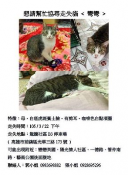 【尋找喵咪~彎彎 高雄市前鎮區光華三路173號龍騰社區B3停車場】 轉貼內容高雄前鎮區。懇請幫忙協尋走失貓 如果您有發現疑是彎彎的貓咪,懇請立即跟失主聯繫!!! 感恩!!!——————————————————–特徵:母。白底虎斑賓士臉。有剪耳。咖啡色白點項圈走失時間:105 / 3 / 22 下午14:10左右走失地點:龍騰社區B3停車場( 高雄市前鎮區光華三路173...... [閱讀更多]