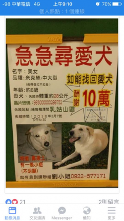 【尋找狗狗~美女 地點 桃園市楊梅區乳姑山區】 轉貼內容聯絡電話 0922577171http://twpetsearch.arlinks.net/2016/03/taoyuan-yangmei.html ... [閱讀更多]