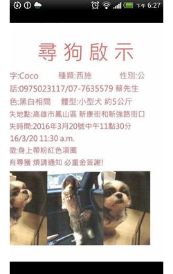 【尋找西施~Coco 地點 高雄市鳳山區新康街和新強路街口】 轉貼內容聯絡電話 0975023117http://twpetsearch.arlinks.net/2016/03/coco-kaohsiung-fongshan-shihtzu.html ... [閱讀更多]