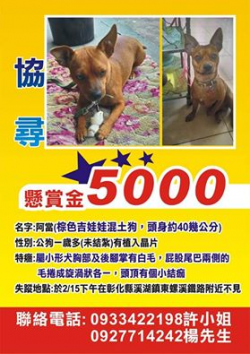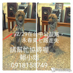 【尋找狗狗~嘟嘟 地點 桃園縣中壢市中央大學後門中央路】 轉貼內容代 PO,可以的話想請大家幫忙協助這隻小狗,是中央大學後門中央路,新明牛肉麵館養的小狗,名字為嘟嘟,公狗,晚上自已出來散步後就沒有回來了。若有善心人士發現,可私訊或電話與我聯絡電話:0911-756761謝謝。http://twpetsearch.arlinks.net/2016/03/taoyuan-zhongli_11...... [閱讀更多]