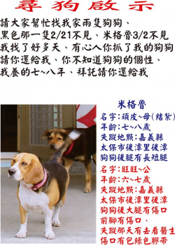 【尋找狗狗~頑皮 & 旺旺 地點 嘉義縣太保市後潭裡後潭】 轉貼內容http://twpetsearch.arlinks.net/2016/03/jiayi-taibao-beagle.html ... [閱讀更多]