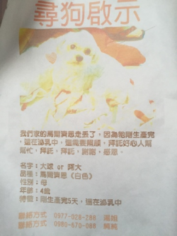 【尋找瑪爾濟斯~大球 地點 新北市淡水區】 轉貼內容聯絡電話 0977028288http://twpetsearch.arlinks.net/2016/02/new-taipei-tamsui-maltese.html ... [閱讀更多]