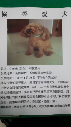 【尋找貴賓犬~Cookie 地點 南投縣竹山鎮秀傳醫院旁停車場】 轉貼內容 聯絡電話 0922626535http://twpetsearch.arlinks.net/2016/02/cookie-nantou-zhushan-poodle.html ... [閱讀更多]