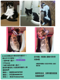 尋找貓咪~牛牛&money 地點 南投縣仁愛鄉 Ren』ai , Nantou 【尋找貓咪~牛牛&money 地點 南投縣仁愛鄉】 轉貼內容緊急更新8/15日傍晚走失尋找我的貓孩子! 黑白賓士貓牛牛已結紮八歲…有植入晶片!三花貓money三歳已結紮…沒有植入晶片! 連絡人:黃瀞萩09…https://twpetsearch.arlinks.net/2019/...... [閱讀更多]