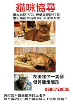 尋找貓咪~ 地點 新北市板橋區 Banqiao , New Taipei 【尋找貓咪~ 地點 新北市板橋區】 轉貼內容請大家幫幫忙,這是朋友過世姐姐留下來的貓,對她很重要,晶片是她姐姐的電話跟名子可能打不通,請大家有看到電聯朋友 或fb私訊我也可以(朋友沒fb) 感謝 ?�…https://twpetsearch.arlinks.net/2019/08/banqiao-new-...... [閱讀更多]